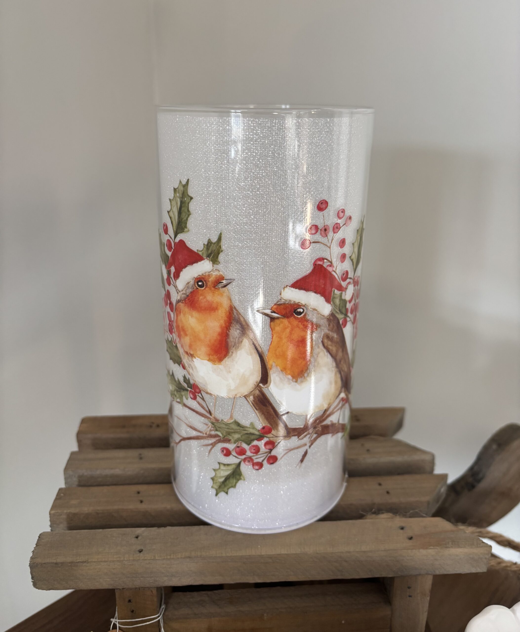 Cylinder-shaped LED light made of translucent material with a printed design featuring 2 robins wearing red Santa hats, holly leaves, and red berries. Predominantly white background with multicolored details