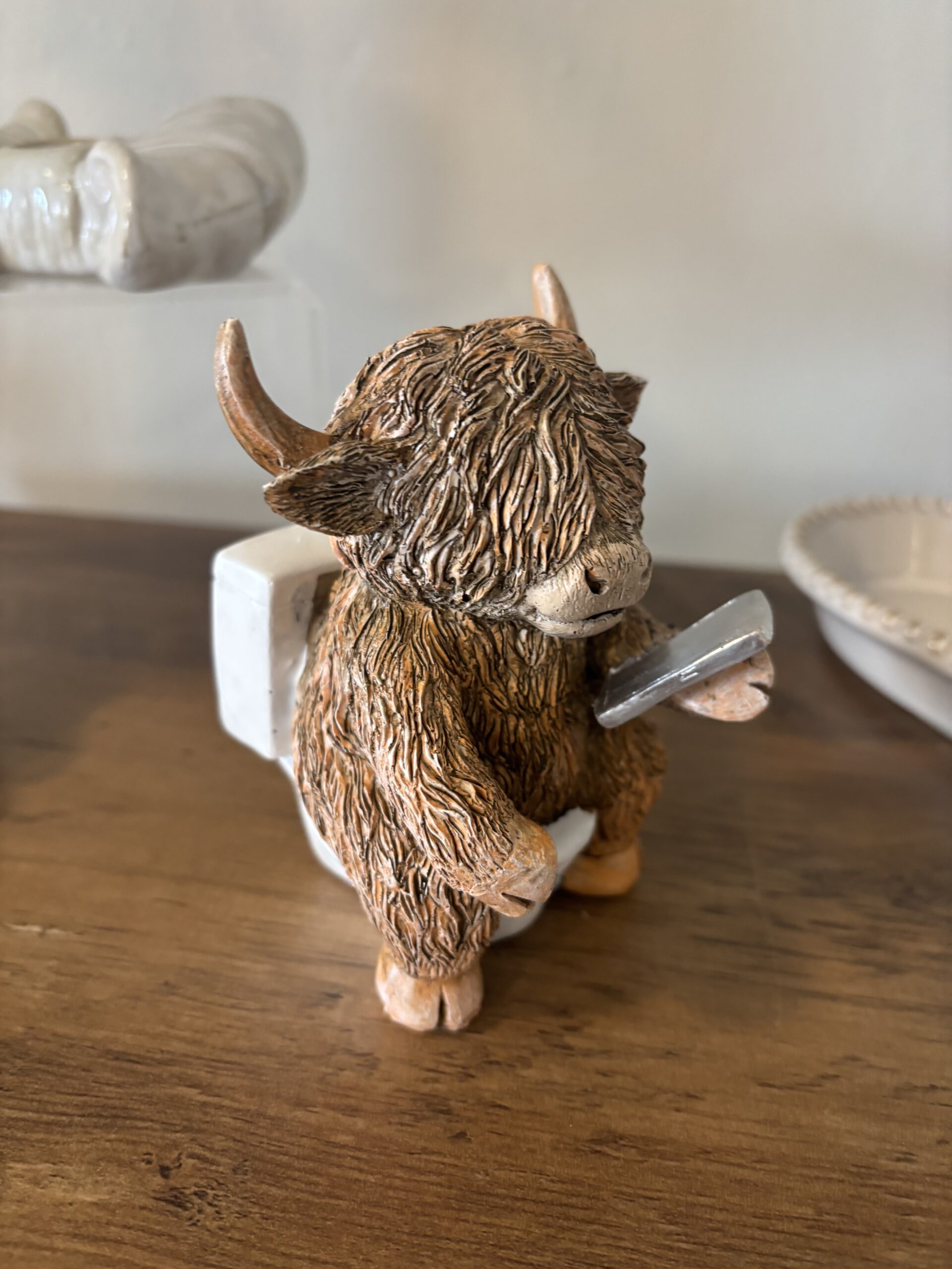 HIGHLAND COW SAT ON THE TOILET ORNAMENT