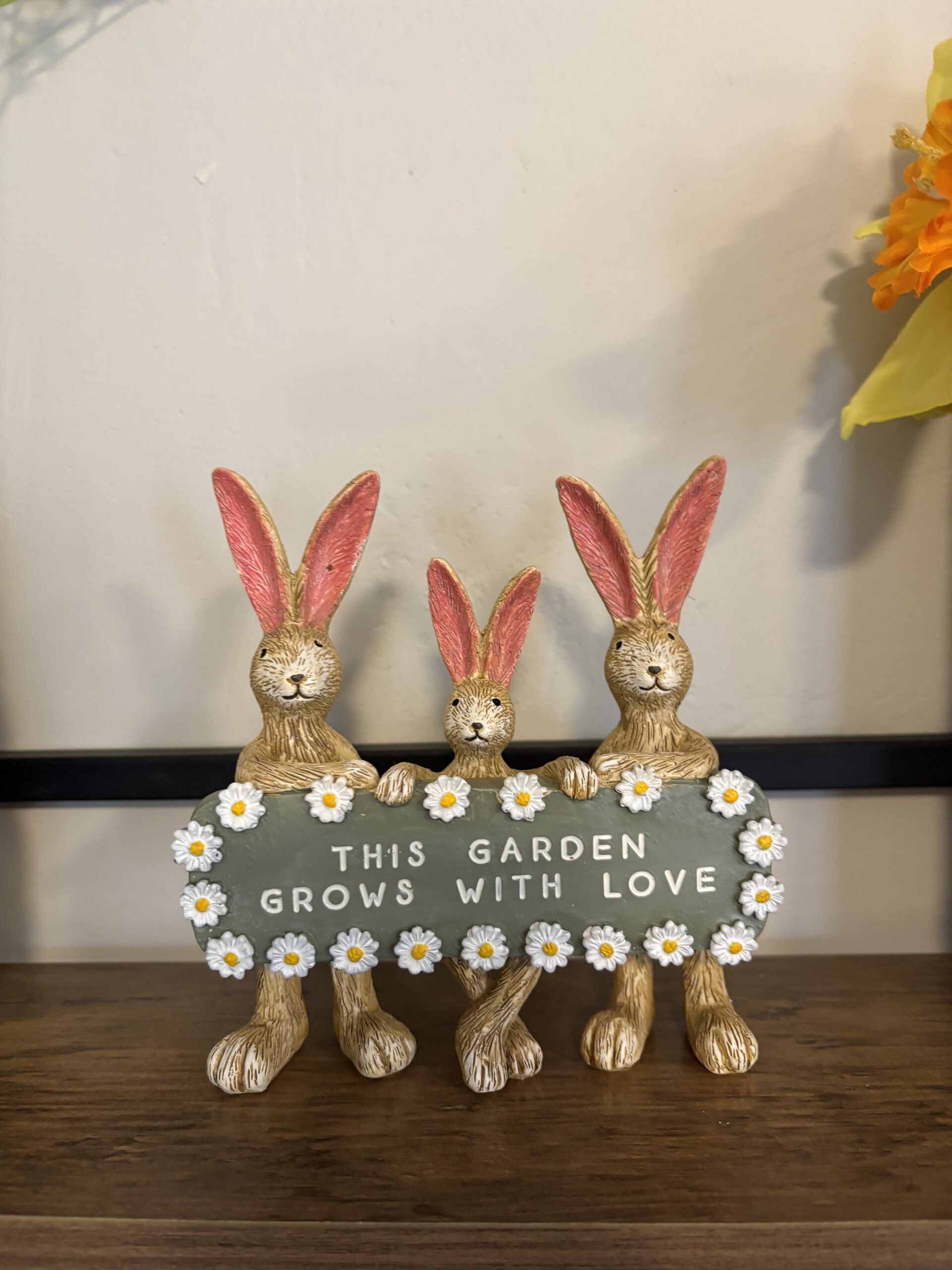This charming rabbit family figurine holding a cute plaque titled “This Garden Grows With Love,” adds a touch of warmth and affection to any space.