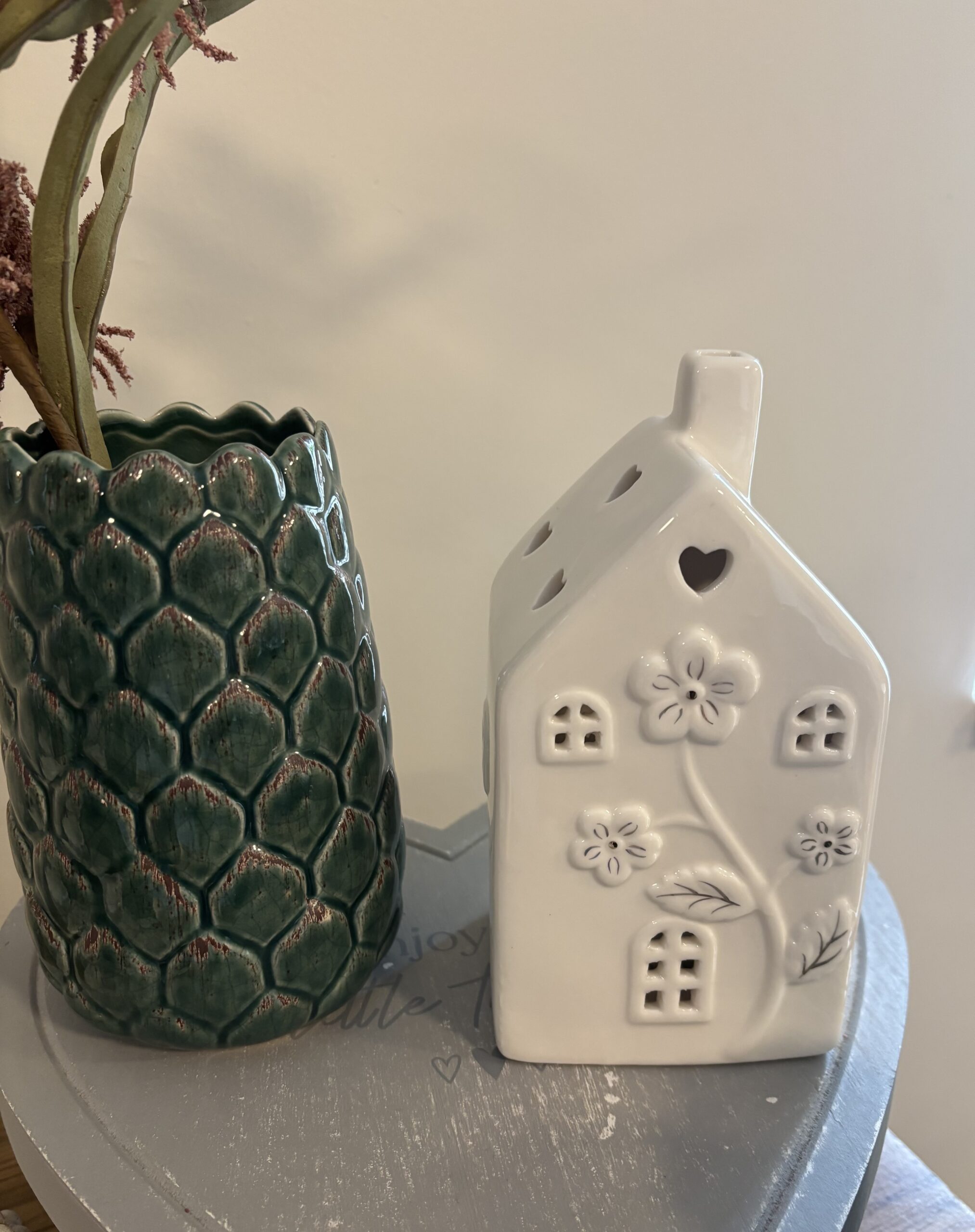 Large white porcelain house featuring built-in LED light, 3D flower details on the front, and window cut-outs illuminated by LED