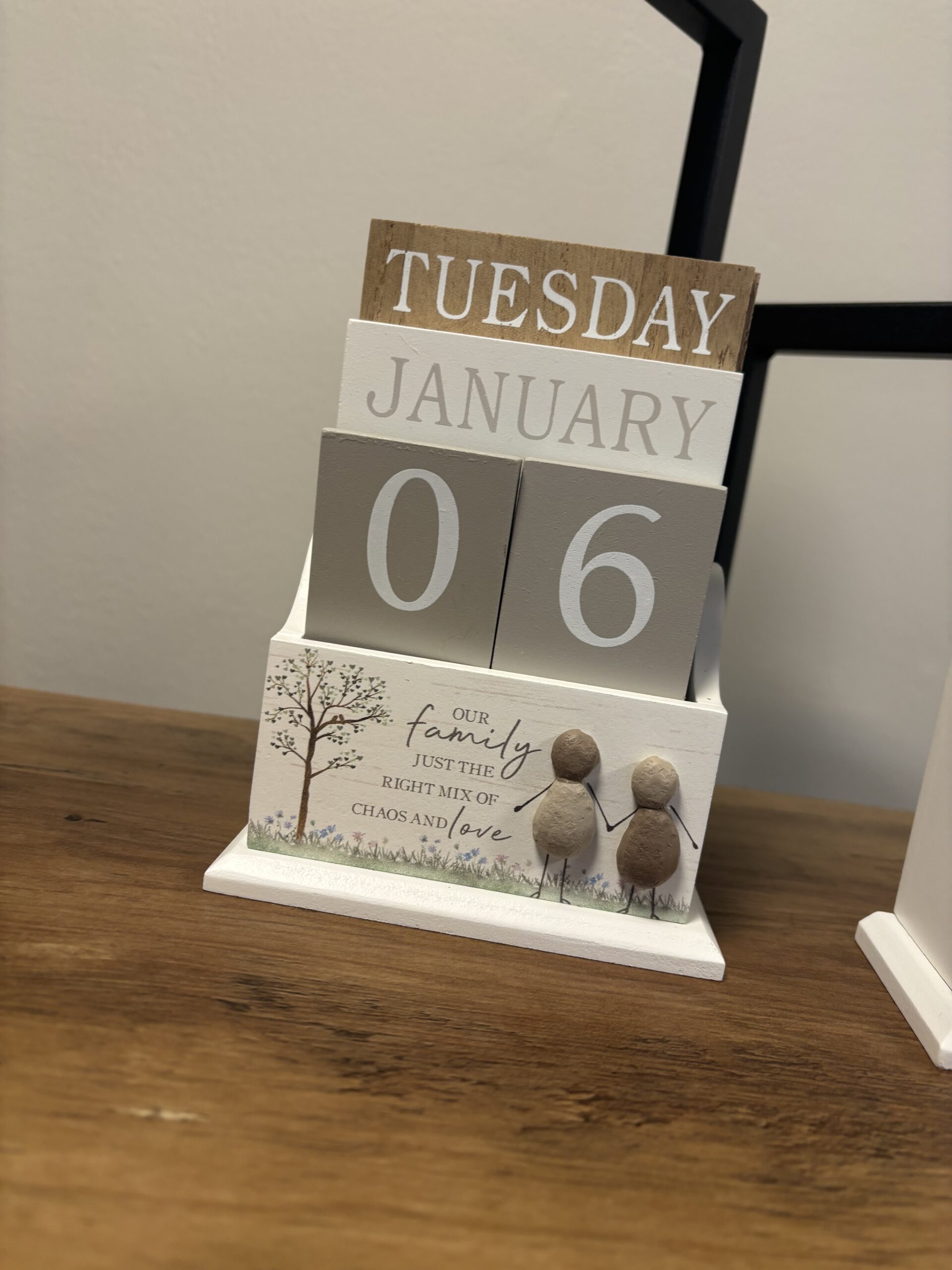 A natural toned wooden block calendar in a Pebble family design. Featuring 4 moveable blocks, scripted text saying  our family is just the right mix of chaos and love.