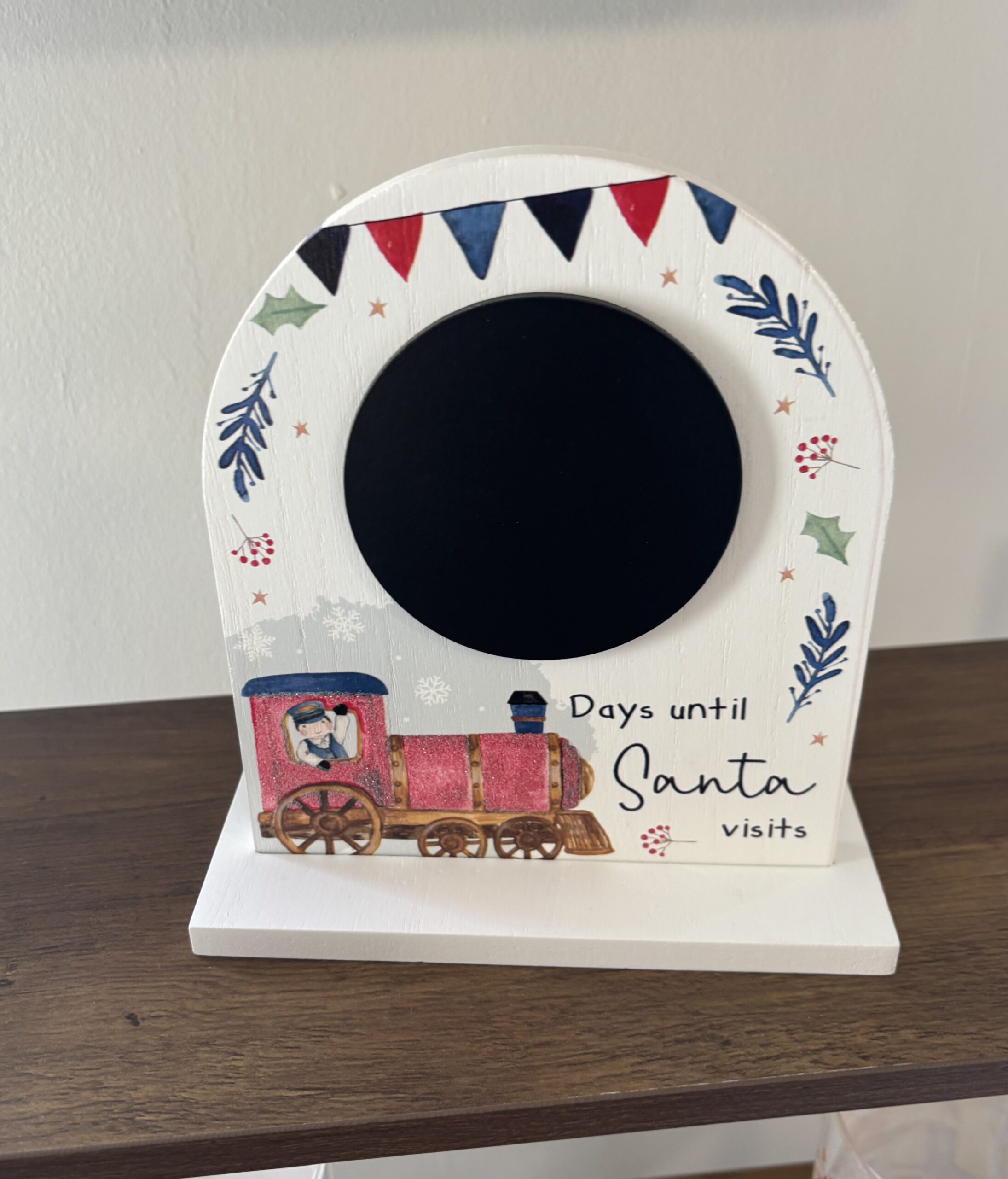 White wood block featuring a chalkboard circle for countdown, decorated with a red and blue train and festive holiday graphics, and printed with “Days until Santa visits”.